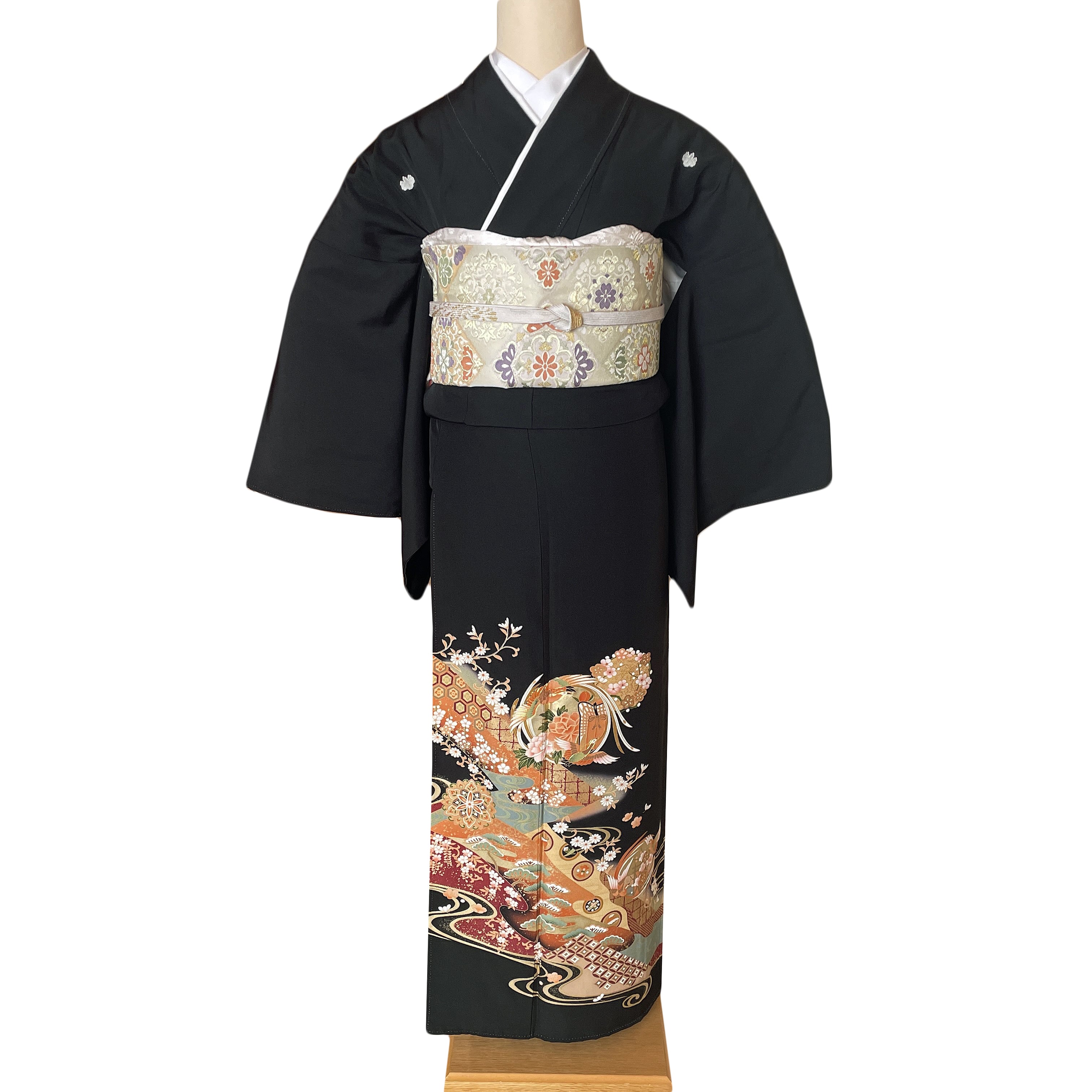 【kuro4】黒留袖レンタル■正絹■流れの有る大胆な構図に松、梅、亀甲そして花車に鶴の柄■