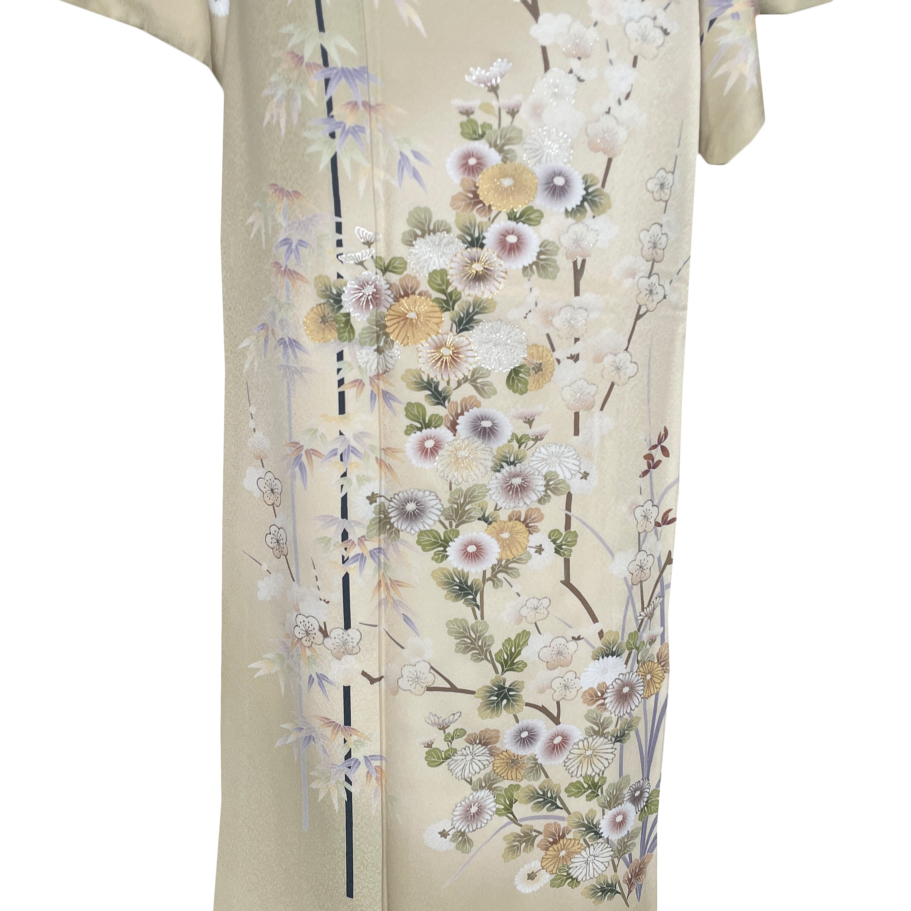 【hu25】訪問着レンタル■淡い黄緑地に見頃中央を丸く淡い黄色ぼかし、そして菊や梅などの小花が華やかな柄■正絹フリーサイズ
